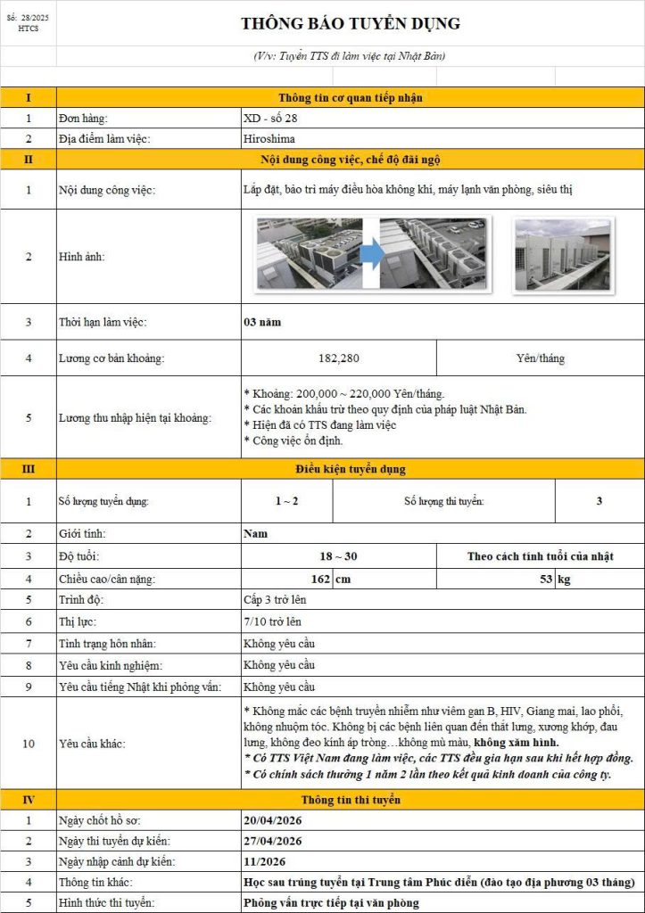 1 Tháng Tư, 2026 nguyen admin TUYỂN 2 NAM LẮP ĐẶT VÀ BẢO TRÌ ĐIỀU HÒA LÀM VIỆC TẠI HIROSHIMA (PHỎNG VẤN THÁNG 04/2026) Tin Liên Quan:TUYỂN 1 NAM ĐƠN HÀNG CHẾ BIẾN THỰC PHẨM THÁNG 04/2025Tuyển 2 nam chế tạo khuôn cắt tháng 10Tuyển 4 nam đơn hàng Hàn, lắp rápTuyển 2 nam chống thấm công trình, nhà ởTuyển 4 nam gia công và lắp đặt cốt thép Trả lời HủyEmail của bạn sẽ không được hiển thị công khai. Các trường bắt buộc được đánh dấu *Bình luận * Tên * Email * Trang web Lưu tên của tôi, email, và trang web trong trình duyệt này cho lần bình luận kế tiếp của tôi. Δ