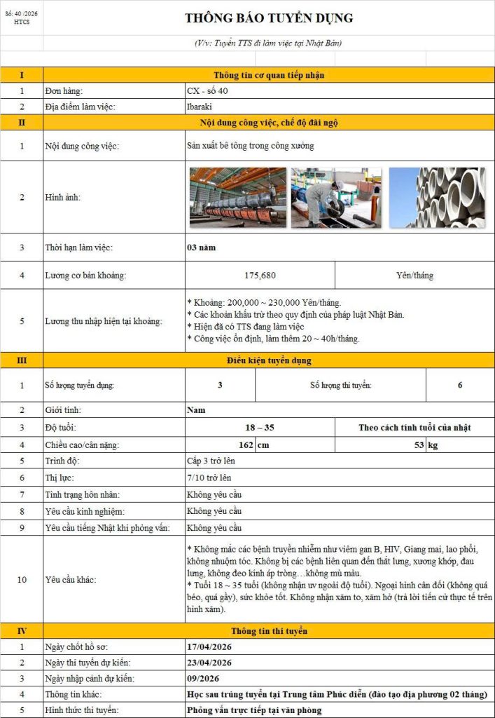 1 Tháng Tư, 2026 nguyen admin tuyển 3 nam sản xuất bê tông làm việc tại ibaraki (phỏng vấn tháng 04/2026) Tin Liên Quan:TUYỂN 2 NAM ĐƠN HÀNG GIA CÔNG NỘI THẤT, SẢN XUẤT SẢN PHẨM TẤM VÁCH PANEL THÁNG 05/2025TUYỂN 3 NAM ĐƠN HÀNG XÂY DỰNG NHÀ Ở, LẮP GHÉP KHUNG THÉP THÁNG 04/2025TUYỂN 8 NAM ĐƠN HÀNG SẢN XUẤT LINH KIỆN OTOTUYỂN 3 NAM ĐƠN HÀNG GIA CÔNG CƠ KHÍTUYỂN 2 NAM ĐƠN HÀNG ĐIỀU KHIỂN MÁY KHOAN XÂY DỰNG THÁNG 04/2025 Trả lời HủyEmail của bạn sẽ không được hiển thị công khai. Các trường bắt buộc được đánh dấu *Bình luận * Tên * Email * Trang web Lưu tên của tôi, email, và trang web trong trình duyệt này cho lần bình luận kế tiếp của tôi. Δ